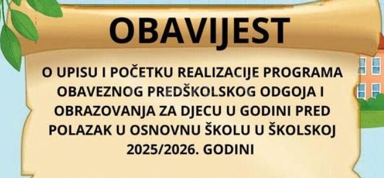 JU „Umihana Čuvidina“ Breza obavještava roditelje i staratelje da će se upis djece u obavezni program predškolskog odgoja i obrazovanja za djecu u godini pred polazak u osnovnu školu vršiti početkom februara 2026. godine.