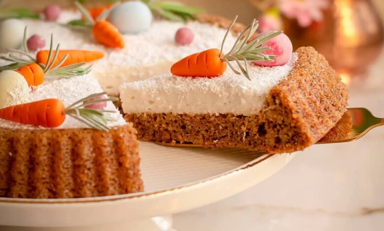 Ukrasiti kolač pripremljenim mrkvicama i marcipan jajima.