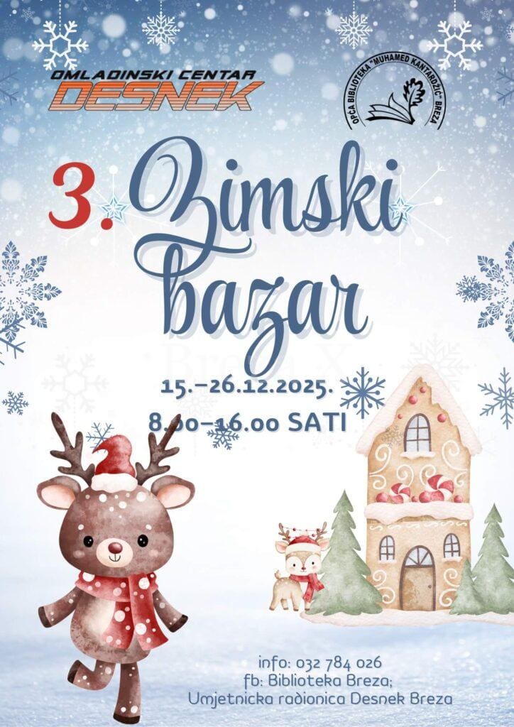 Umjetnička radionica “Desnek” Breza u saradnji s Općom bibliotekom “Muhamed Kantardžić” Breza i ove godine organizuje tradicionalni 3. Zimski bazar, događaj koji je za kratko vrijeme postao omiljeno mjesto susreta ljubitelja umjetnosti, rukotvorina i pisane riječi.