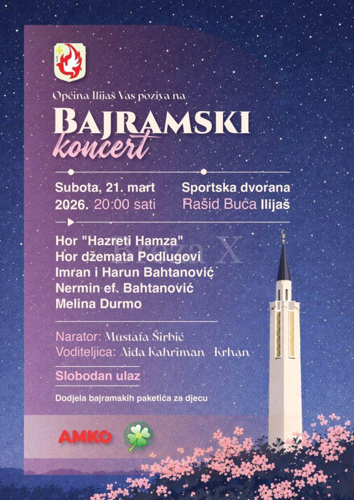 Povodom nastupajućeg Bajrama, Općina Ilijaš organizuje svečani Bajramski koncert, na koji srdačno poziva sve građane da svojim prisustvom uveličaju ovu posebnu večer ispunjenu duhovnom muzikom, zajedništvom i radošću.