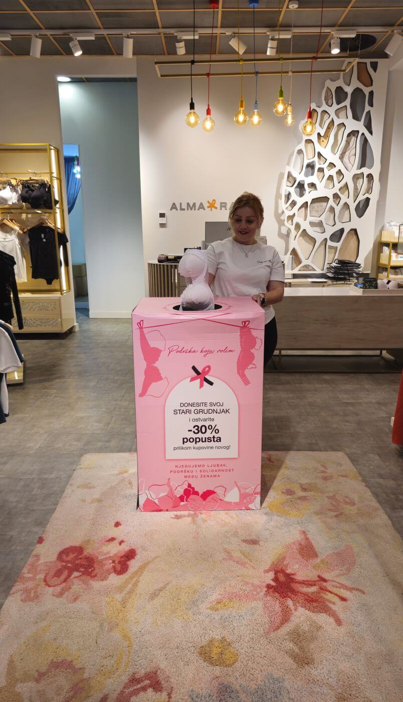 Trenutno traje akcija prikupljanja starih grudnjaka za podršku borbi protiv karcinoma dojke. Grudnjaci će biti izloženi na Vilsonovom šetalištu u oktobru – mjesecu borbe protiv ove bolesti kao simbol podrške ženama. Kupci mogu ostaviti svoje stare grudnjake u bilo kojoj Alma Ras poslovnici i dobiti 30% popusta na novi grudnjak.