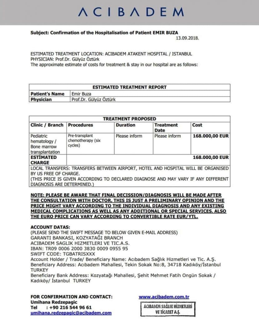 “Ispitivanjem je utvrđeno da je kod Emira u pitanju dijagnoza: large cell lymphoma. Preporuka za terapiju je 6 ciklusa posebne kemoterapije koja se primjenjuje kod pacijenata koji se pripremaju za transplantaciju i cijena jedne seanse je 28.000 eura”, stoji u nalazu iz klinike Acibadem.