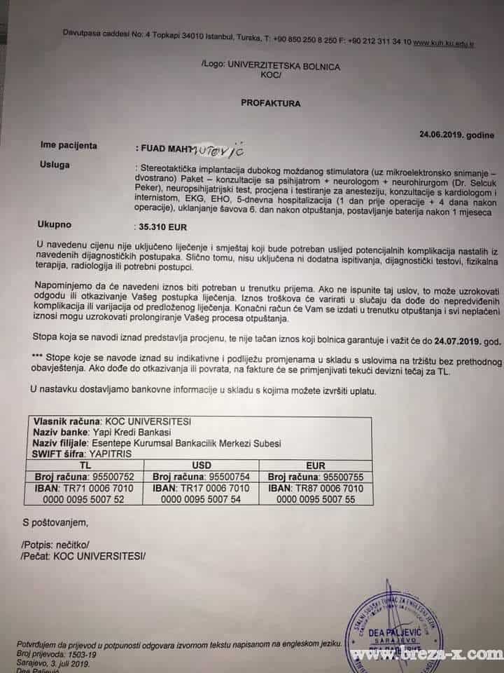 Oni bliži mojoj porodici znaju da se moj babo FUAD MAHMUTOVIĆ već 9 godina bori sa PARKINSONOVOM BOLESTI. Do sada smo uspijevali, sami i sa raspolozivim terapijama utjecati na razvijanje bolesti. Ove godine uspjeli smo doći i do ljekara u Koç Universitesi Hastanesi u Turskoj, koji su nam rekli da otac može izvršiti operaciju. Operacija podrazumijeva ugradnju DBS-a (duboka moždana stimulacija) koja na taj način znatno poboljšati život mog oca. U isto vrijeme sreća i briga kako prikupiti 35.310 €. Voljela bih kao i svako da imamo uređen zdravstveni sistem i institucije kojim bih se ja sada mogla obratiti, ali nemamo. Umjesto njih, ja se obraćam vama. Svim dobrim ljudima, prijateljima, kompanijama, da nam pomognete da prikupimo potrebni novac za izliječenje mog oca. Unaprijed hvala svim ljudima koji nam pomognu da uspijemo u ovoj borbi. MOLIM VAS DIJELITE DALJE.