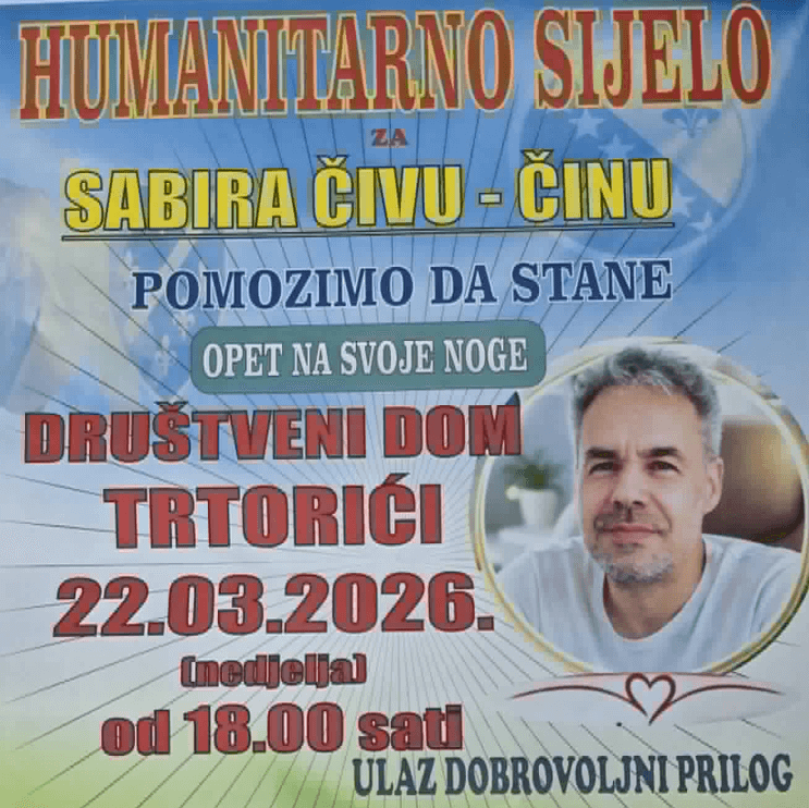 U Društvenom domu Trtorići u nedjelju, 22.03.2026. godine, sa početkom u 18:00 sati, održat će se humanitarno sijelo za Sabira…