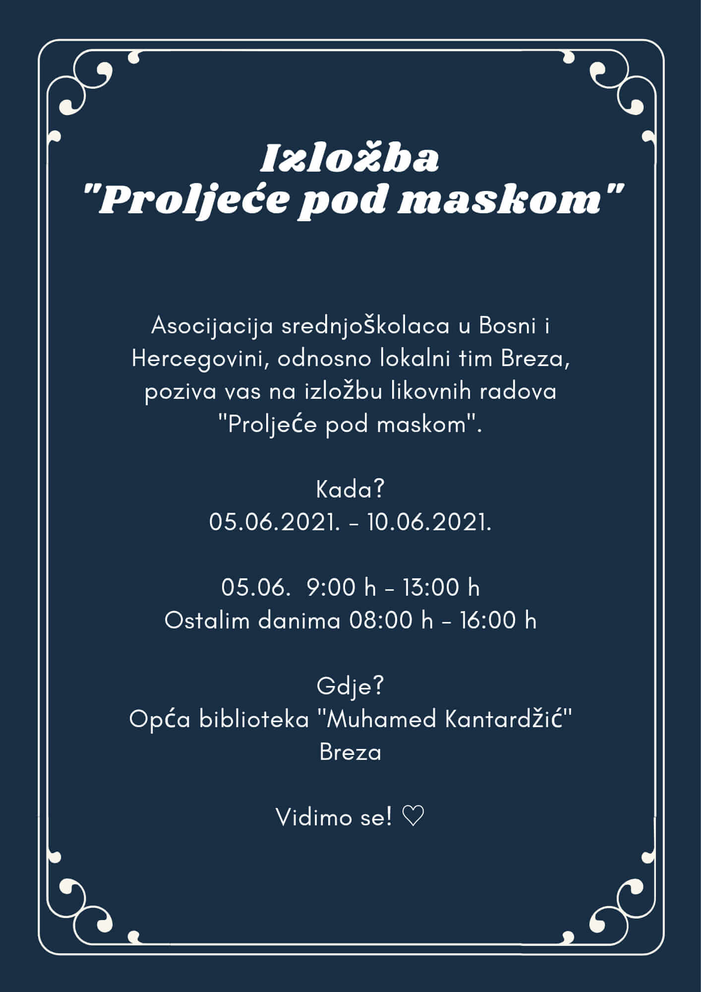 Izložba će se održati od 5. juna do 10. juna 2021. godine u prostorijama Biblioteke Breza.