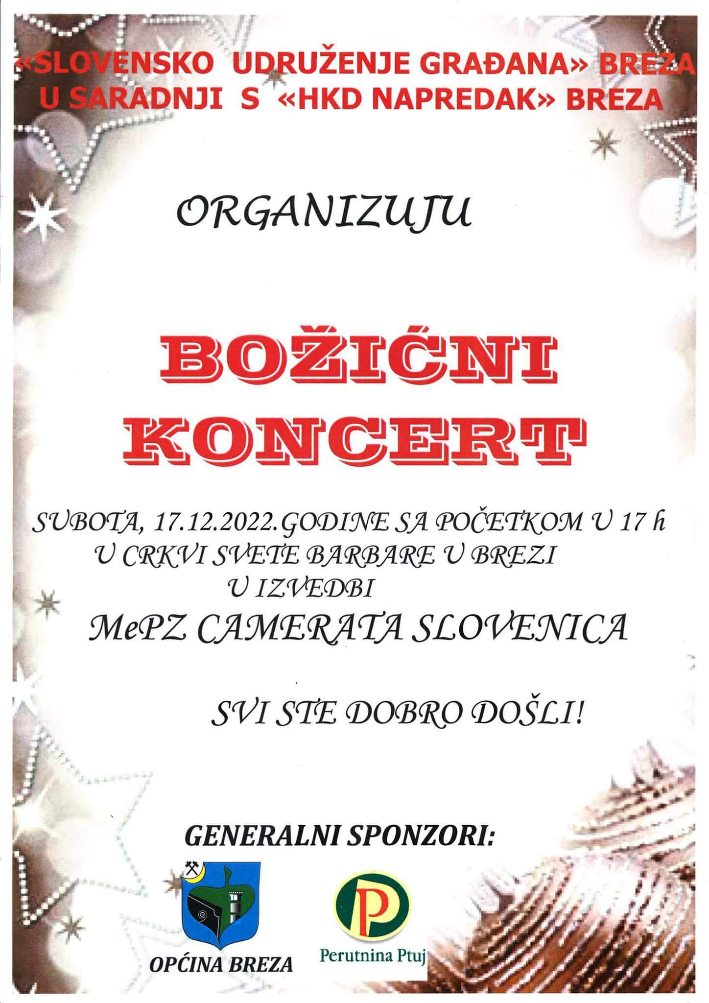 Slovensko udruženje građana općine Breza i HKD Napredak podružnica Breza organiziraju Božićni koncert na kojem nastupa Mešani pevski zbor “Camerata Slovenica” iz Sarajeva. Koncert će biti upriličen u subotu, 17. decembra u crkvi Svete Barbare u Brezi s početkom u 17 sati.