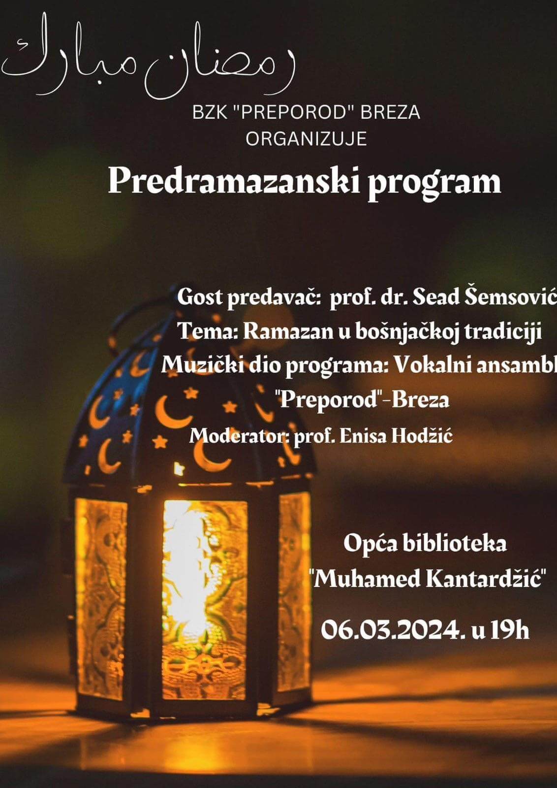 Bošnjačka zajednica kulture “Preporod” Breza organizuje “Predramazanski program” te ovim povodom će se održati predavanje prof. Seada Šemsovića na temu “Ramazan u bošnjačkoj tradiciji”.