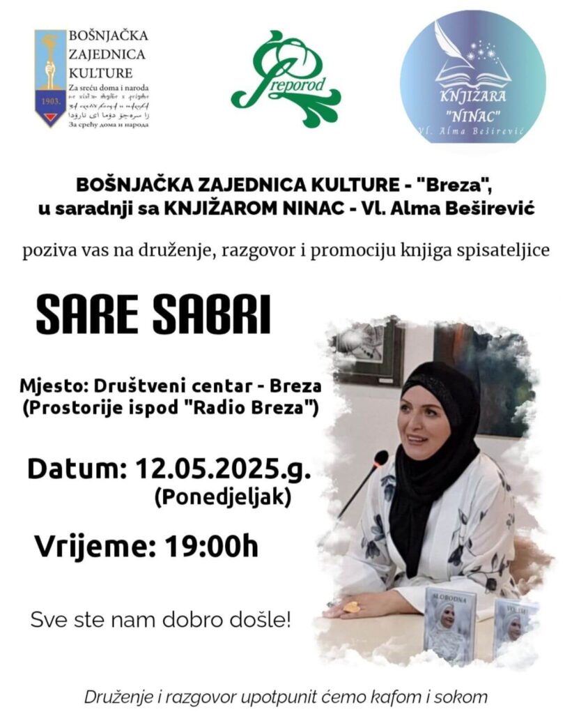 Bošnjačka zajednica kulture Preporod Breza u saradnji sa knjižarom “Ninac” Breza organizuju druženje, razgovor i promociju knjiga spisateljice Sare Sabri, 12. maja 2025. godine u Društvenom centru Breza sa početkom u 19 sati.