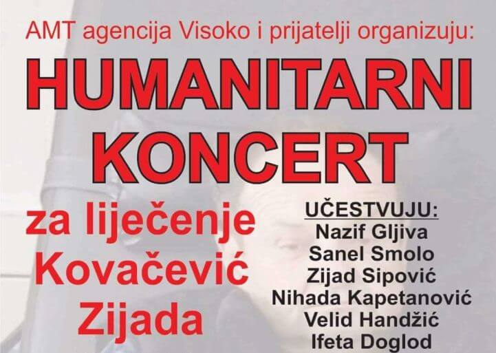 ATM agencija Visoko i prijatelji organizuju humanitarni koncert za liječenje Zijada Kovačevića. Učestvuju: Nazif Gljiva, Sanel Smolo, Nihada Kapetanović, Ifeta…