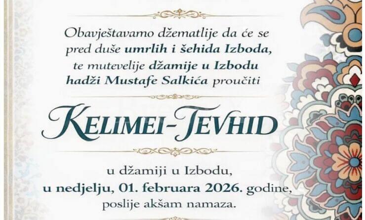 Najava vjerskog programa u Izbodu: Kelimei-Tevhid u nedjelju, 1. februara