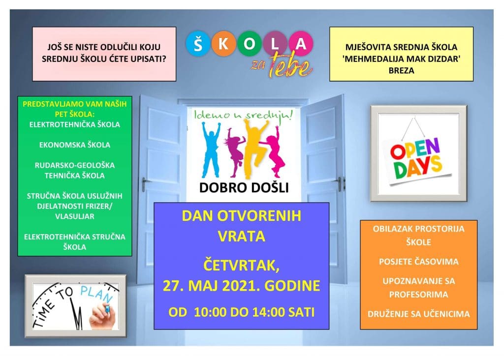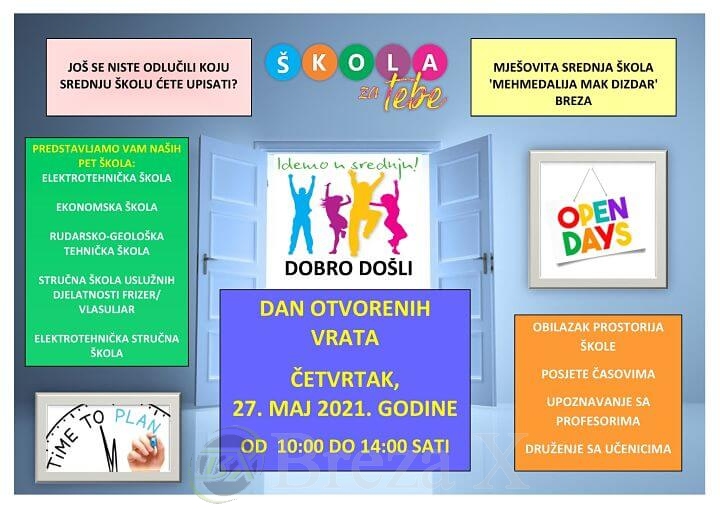 Obavještavamo sve učenike devetih razreda da Mješovita srednja škola ”Mehmedalija Mak Dizdar” u Brezi i ove godine organizuje ”Dan otvorenih vrata” u ČETVRTAK, 27.05. 2021. godine. Svi zainteresirani nas mogu posjetiti sami ili u grupi, u pratnji nastavnika ili roditelja u terminu od 10:00 do 14:00 sati.