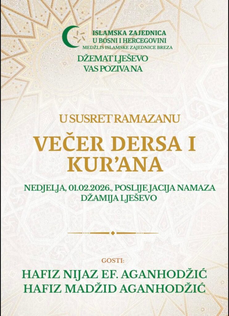 U susret najodabranijem mjesecu u islamskoj godini, mjesecu Ramazanu, Džemat Lješevo, u okviru Medžlisa Islamske zajednice Breza, organizuje Večer dersa i Kur’ana, koja će okupiti vjernike u duhu zajedništva, ibadeta i duhovne pripreme.