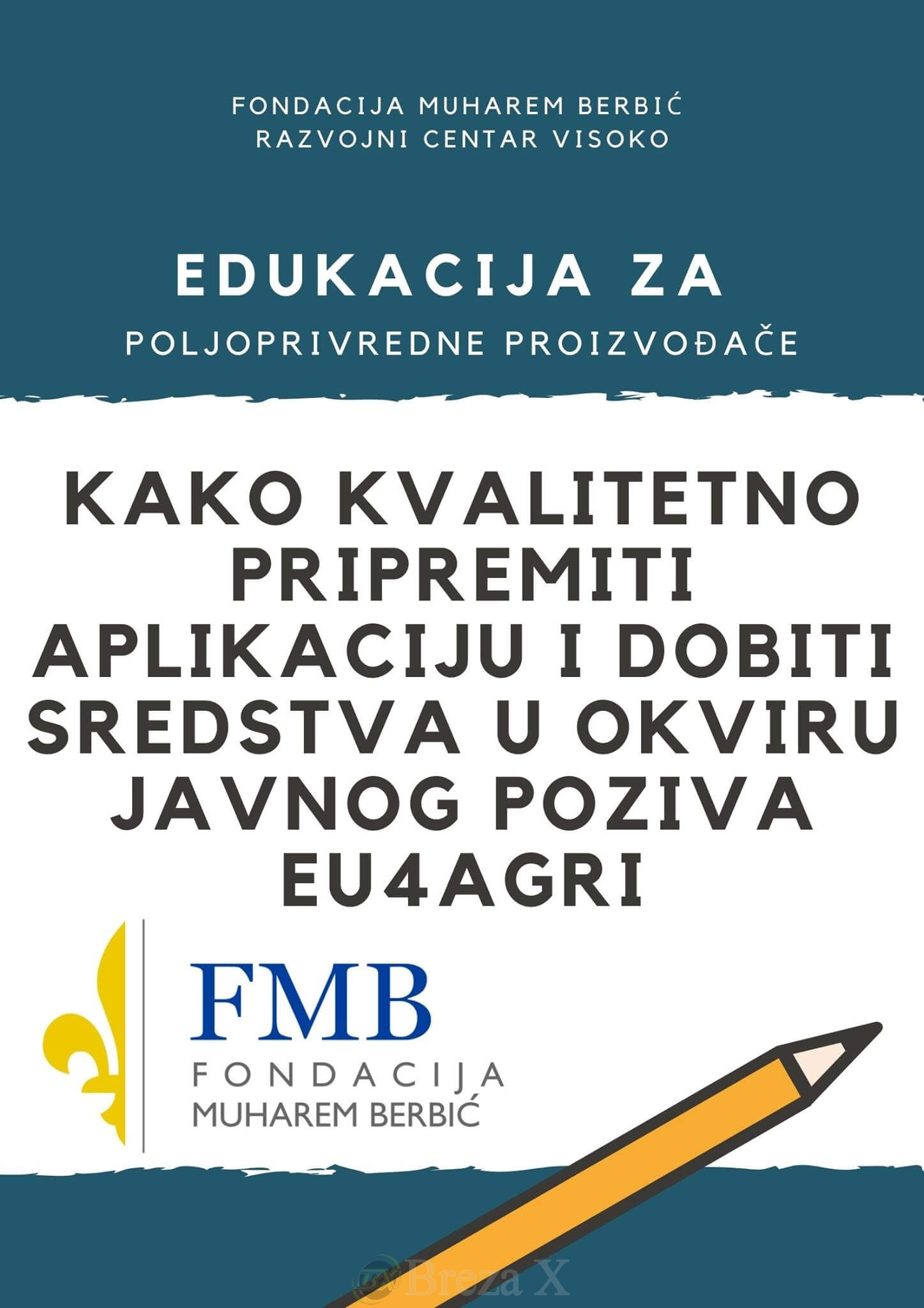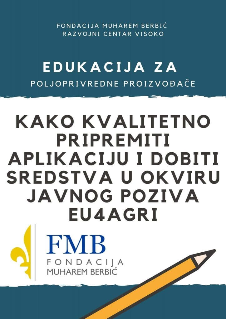Svjesni činjenice da mnogi pojedinci ne posjeduju dovoljno znanja ni iskustva u razvoju aplikacija, Fondacija Muharem Berbić – Razvojni centar Visoko će u narednim danima organizovati edukaciju za sve zainteresovane poljoprivredne proizvođače iz Visokog, Ilijaša, Breze i Kiseljaka, a koja će im uveliko pomoći da njihova aplikacija bude kvalitetna i prilagođena uslovima ovog Javnog poziva.