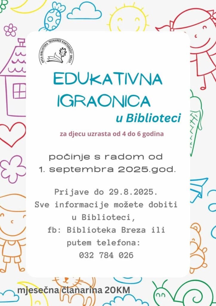 Opća biblioteka “Muhamed Kantardžić” Breza od 1. septembra nastavlja organizovati edukativne igraonice za djecu uzrasta od 4 do 6 godina.