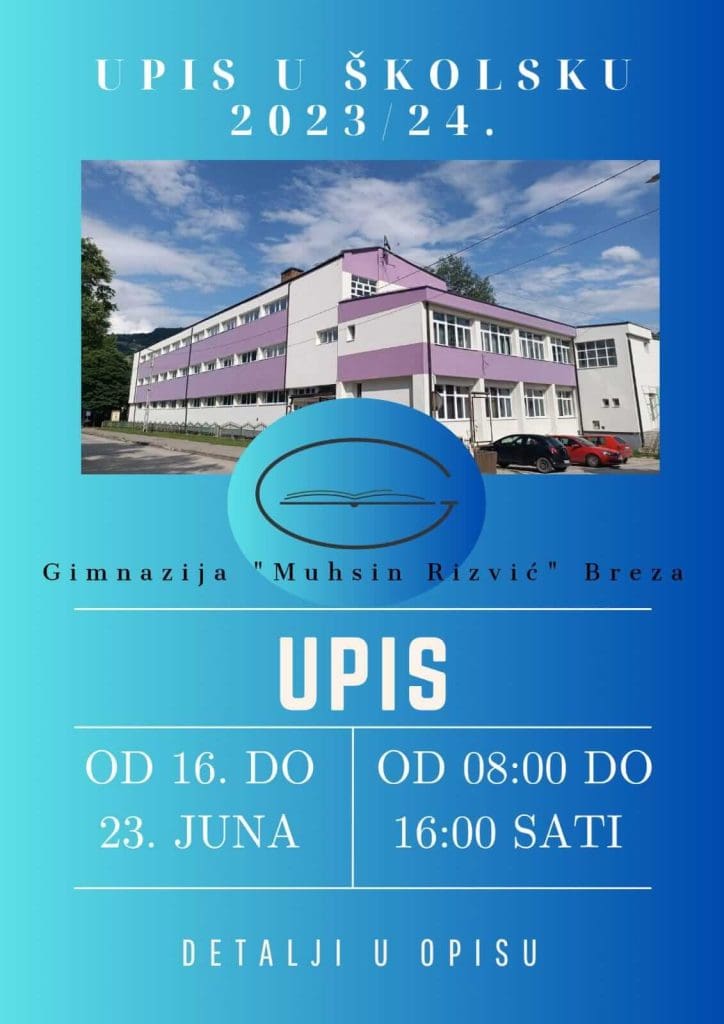 Gimnazija “Muhsin Rizvić” Breza objavljuje Konkurs za upis u prvi razred za školsku 2023/2024. u periodu od 16. do 23. juna 2023. godine, od 8 do 16 sati.