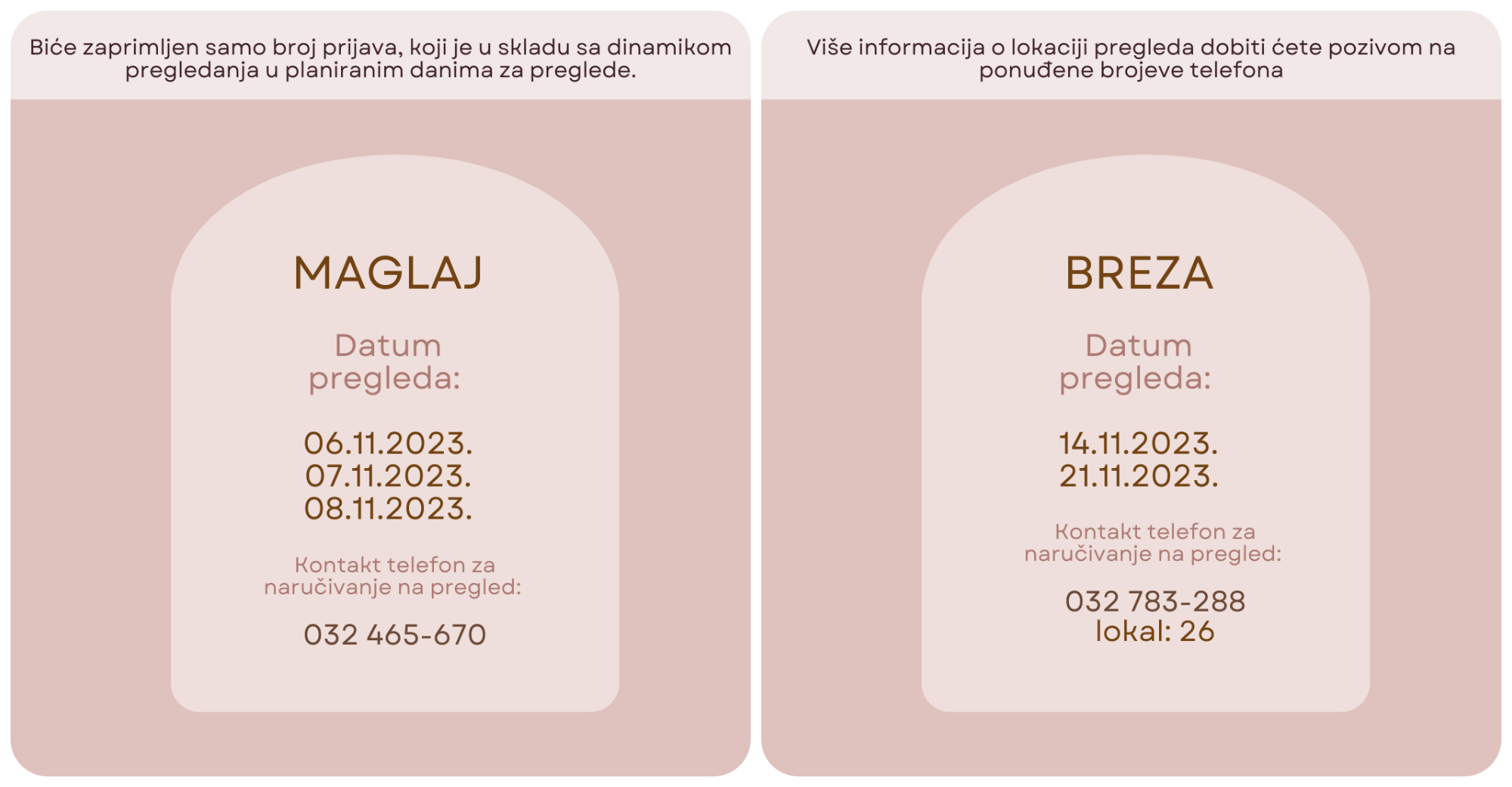 BREZA: utorak 14. i utorak 21. novembar. Kontakt telefon za naručivanje na pregled 032/783-288 lokal 26