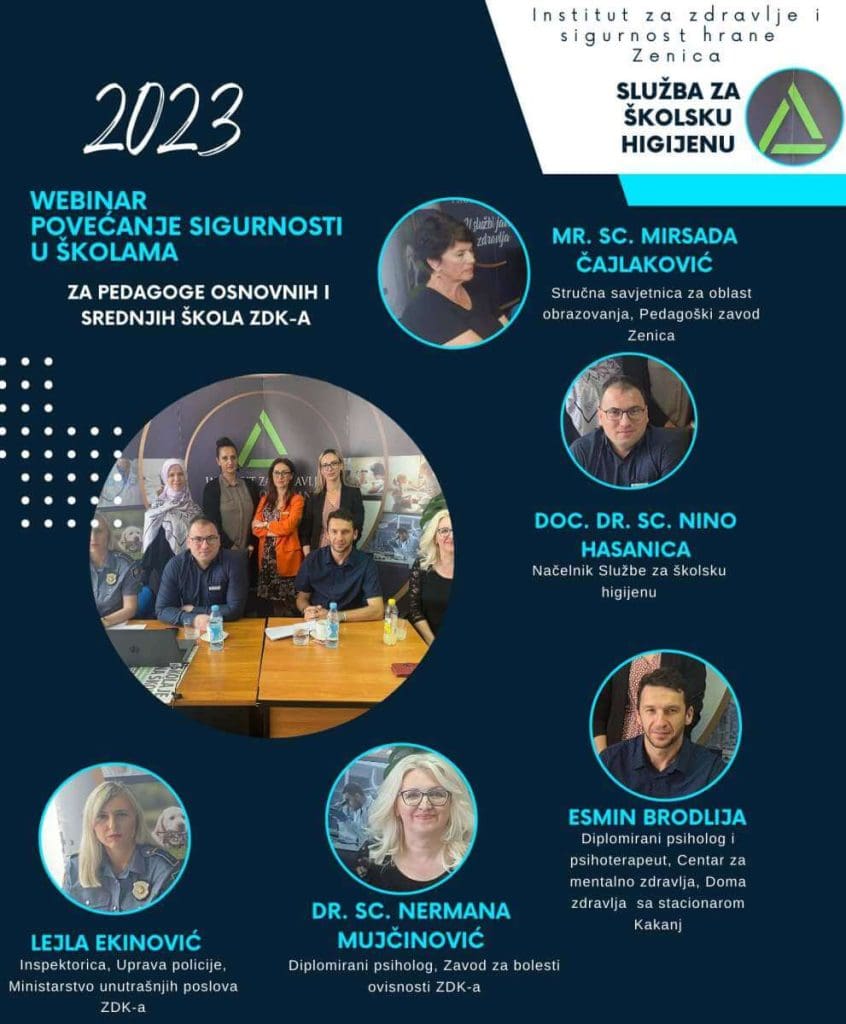 Služba za školsku higijenu Instituta za zdravlje i sigurnost hrane Zenica (INZ) uz podršku tri ministarstva Vlade Zeničko-dobojskog kantona (ZDK), Ministarstava zdravstva, unutarnjih poslova i obrazovanja, nauke, kulture i sporta, te “Partnera u zdravlju”, bila je domaćin webinara “Povećanje sigurnosti u školama”.