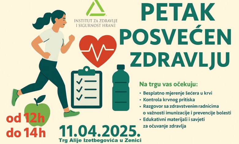 Institut za zdravlje i sigurnost hrane Zenica u saradnji sa Srednjom medicinskom školom u Zenici vas poziva da se pridružite našoj zdravstveno-promotivnoj aktivnosti „ Petak posvećen zdravlju“.