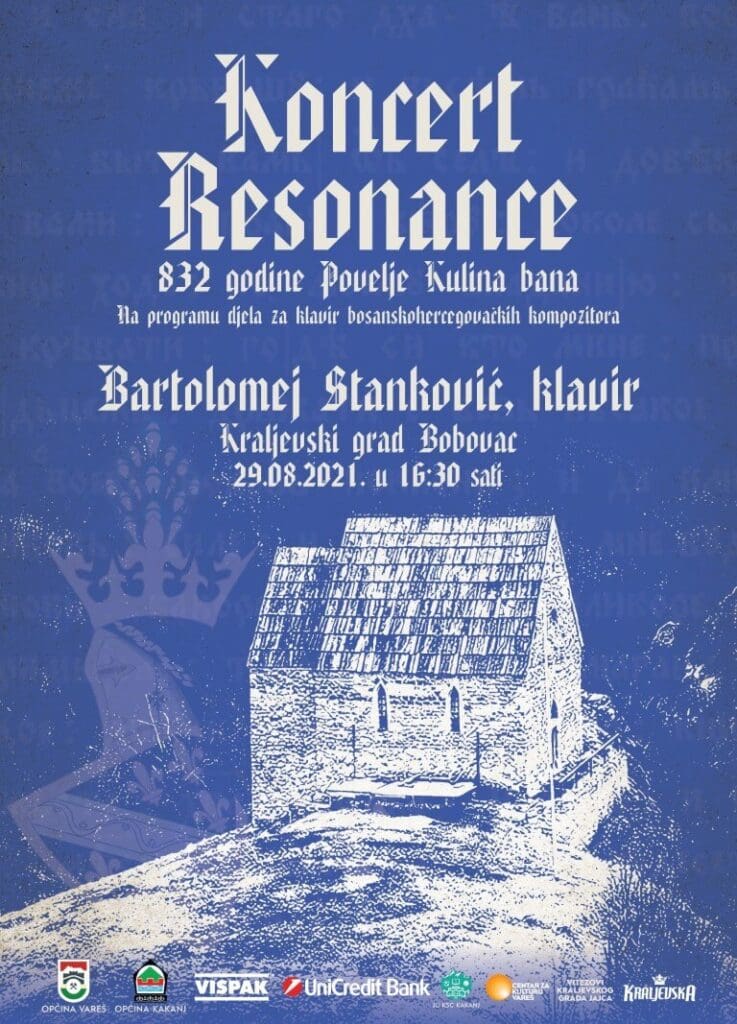 Povodom obilježavanja 832. godišnjice Povelje Kulina bana, koja je napisana 29. augusta 1189. godine, bosanskohercegovački pijanist Bartolomej Stanković održat će koncert Resonance na kraljevskom gradu Bobovcu, u nedjelju, 29. augusta 2021. godine s početkom u 16:30 sati.
