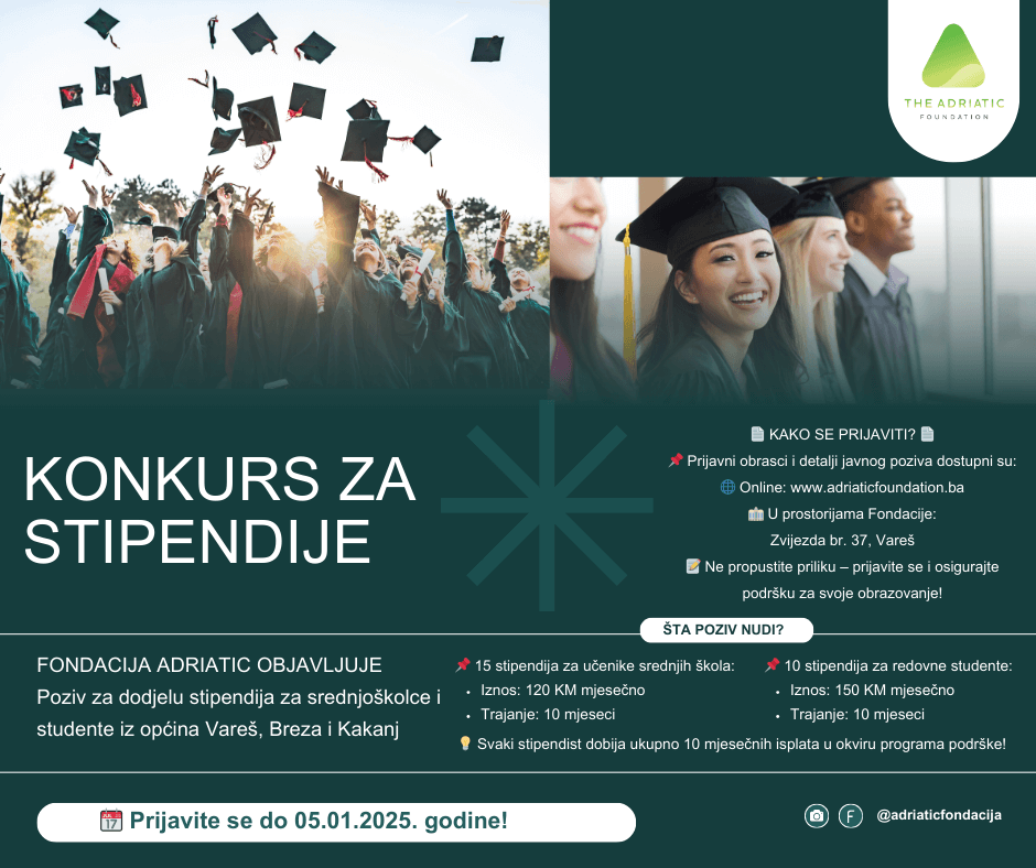Fondacija Adriatic objavila je javni poziv za dodjelu stipendija učenicima srednjih škola i studentima s prebivalištem na području općina Vareš, Breza i Kakanj za akademsku 2024/2025. godinu.