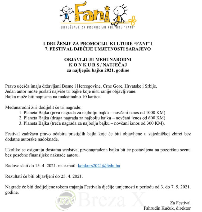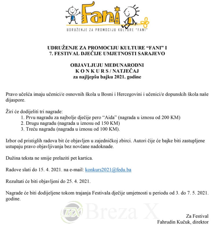 Udruženje za promociju kulture „Fani“ i 7. Festival dječije umjetnosti FEDU raspisali su konkurs/natječaj za najljepšu bajku 2021. godine u kategorijama za pisce i učenike osnovnih škola.