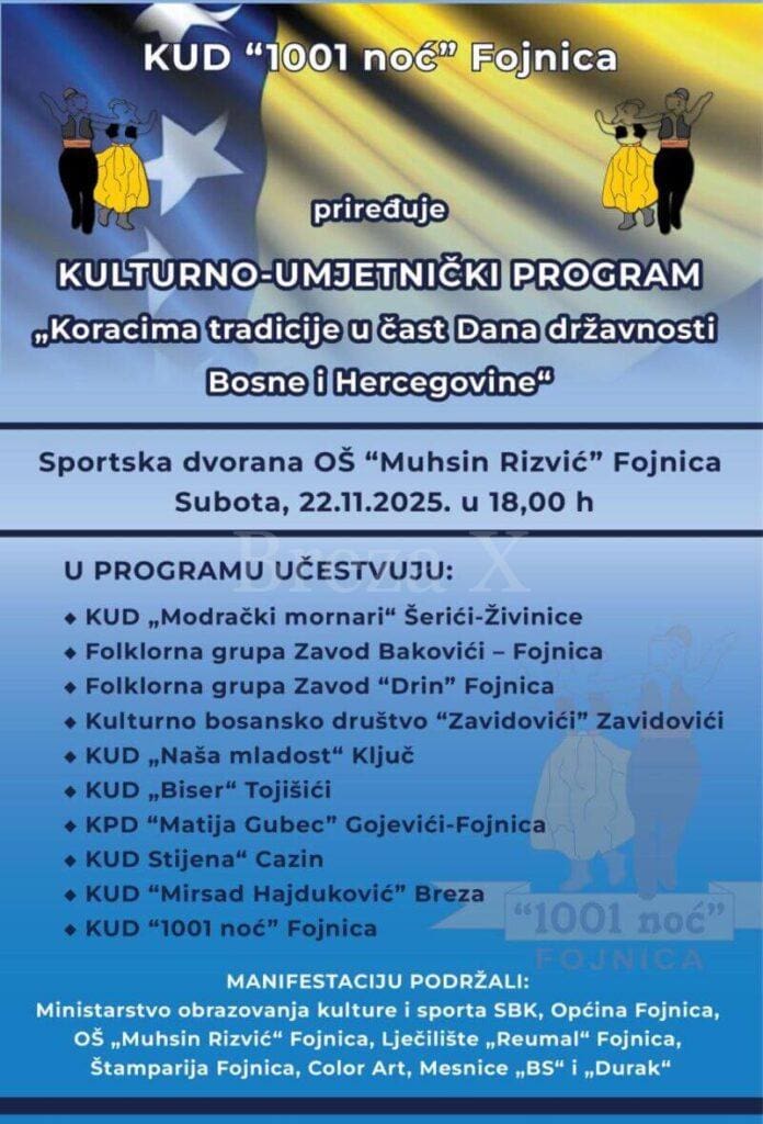 Svečani kulturno-umjetnički program održat će se u sportskoj dvorani OŠ „Muhsin Rizvić“ u Fojnici, u subotu, 22. novembra 2025. godine u 18 sati. Ovaj događaj okuplja društva iz različitih dijelova Bosne i Hercegovine s ciljem očuvanja tradicije, folklorne baštine i zajedničkih kulturnih vrijednosti.
