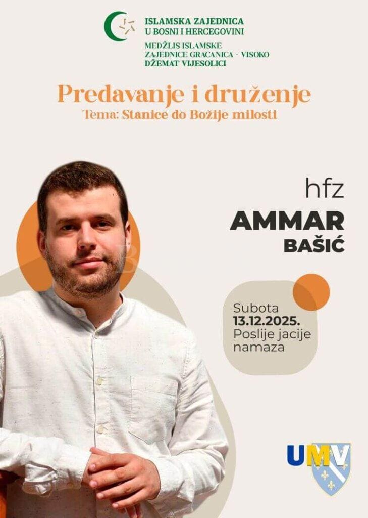 Medžlis Islamske zajednice Gračanica–Visoko, Džemat Vijesolići, najavljuje posebno vjersko druženje koje će obogatiti predstojeće dane duhovnosti i zajedništva. U subotu, 13. decembra 2025. godine, poslije jacije-namaza, u džematu će predavanje održati hfz. Ammar Bašić, jedan od prepoznatljivih mladih predavača i nosilaca hafiske titule u Bosni i Hercegovini.