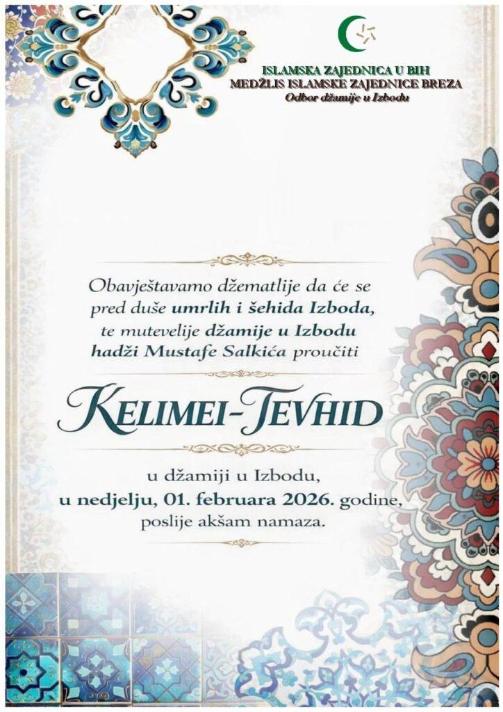 Medžlis Islamske zajednice Breza, putem Odbora džamije u Izbodu, obavještava džematlije i širu javnost da će se u džamiji u Izbodu upriličiti učenje Kelimei-Tevhida.