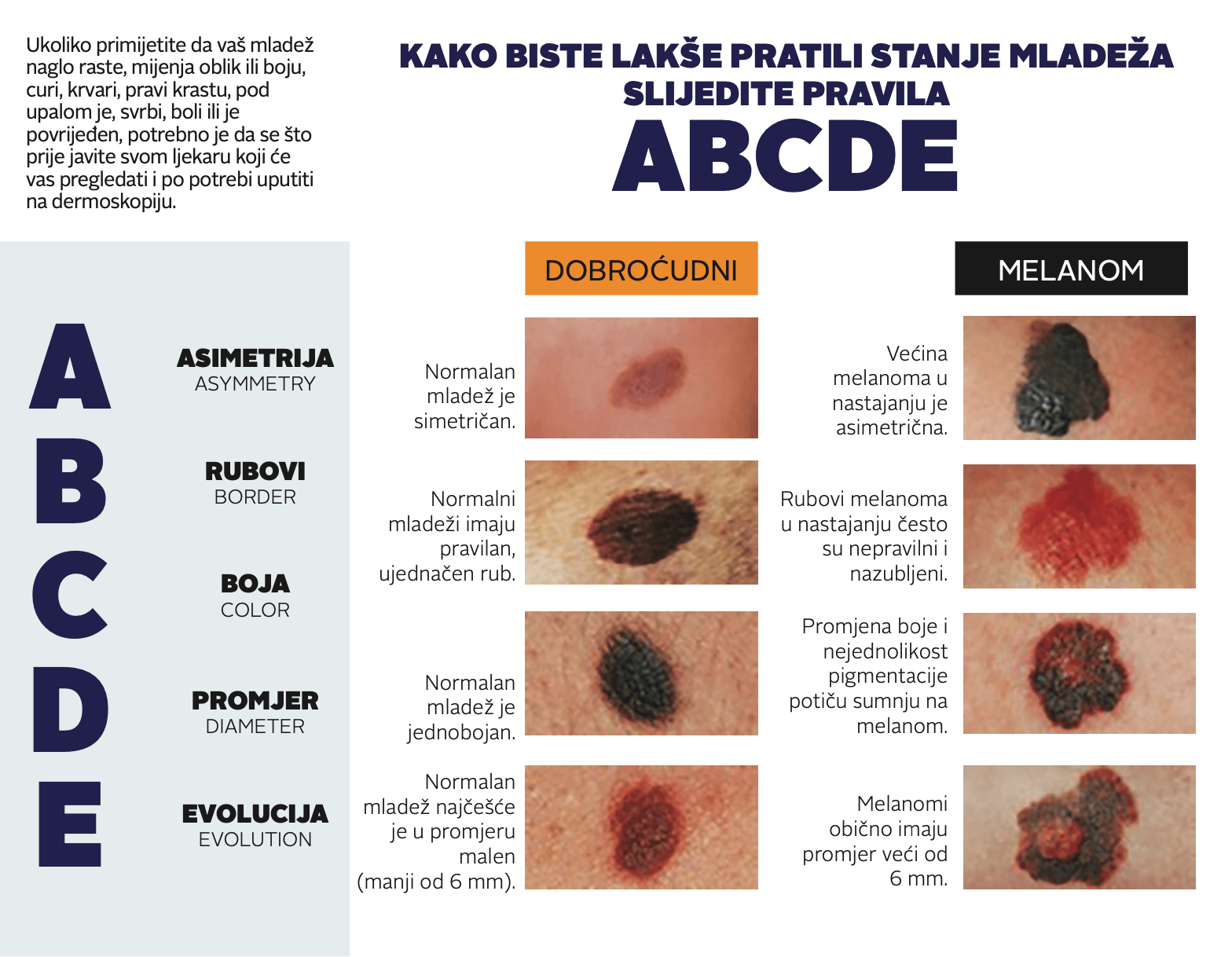 U INZ-u ističu da samopregled kože treba da provodite kako biste ustanovili imate li nove madeže i mrlje na koži, jesu li stari promijenili veličinu, boju, oblik, jesu li asimetrični, imaju iscjedak ili krvare, kakve su boje u odnosu na druge madeže i mrlje na tijelu, imaju li sjajnu površinu ili izgledaju poput ranice koja ne zarasta. Ako na svojoj koži ustanovite bilo kakvu promjenu mladeža, posjetite dermatologa kako biste bili sigurni o čemu je točno riječ. Nemojte zanemariti promjene na svojoj koži nadajući se da će nestati, ne pokušavajte sami liječiti i nikako ne pretpostavljate kako nije ništa ozbiljno.