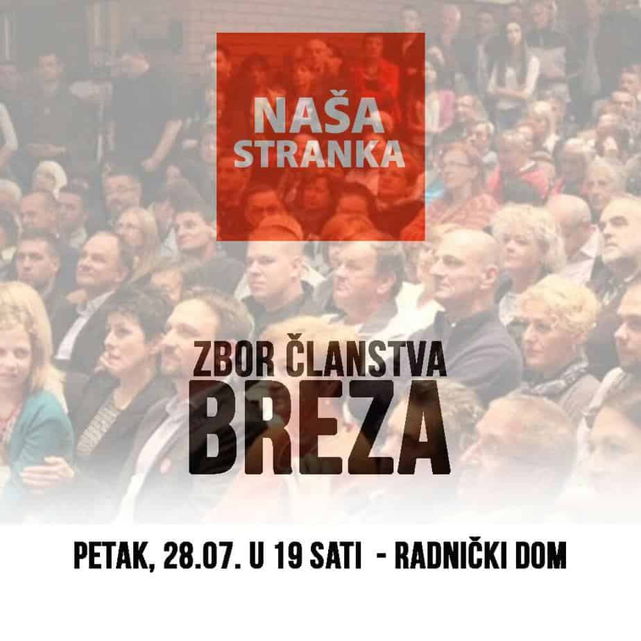 Obavještavaju se građani Breze i simpatizeri Naše Stranke da će se dana 28. jula 2017. godine sa početkom u 19 sati, u prostorijama male sale Radničkog doma (Omladinski centar Desnek), održati Zbor članstva Naše stranke Breza.
