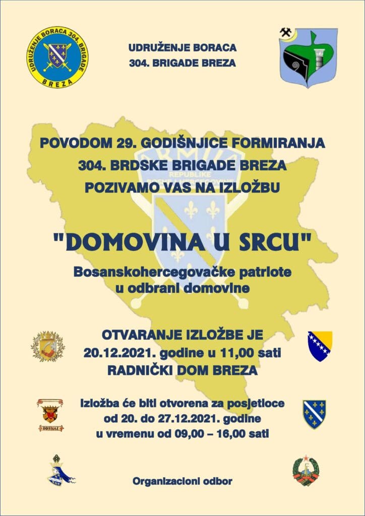 Obavještavamo građane Općine Breza da će dana, 20. decembra 2021. godine u 11 sati u sali Radničkog doma u Brezi biti otvorena izložba “Domovina u srcu” – Bosanskohercegovačke patriote u odbrani domovine.