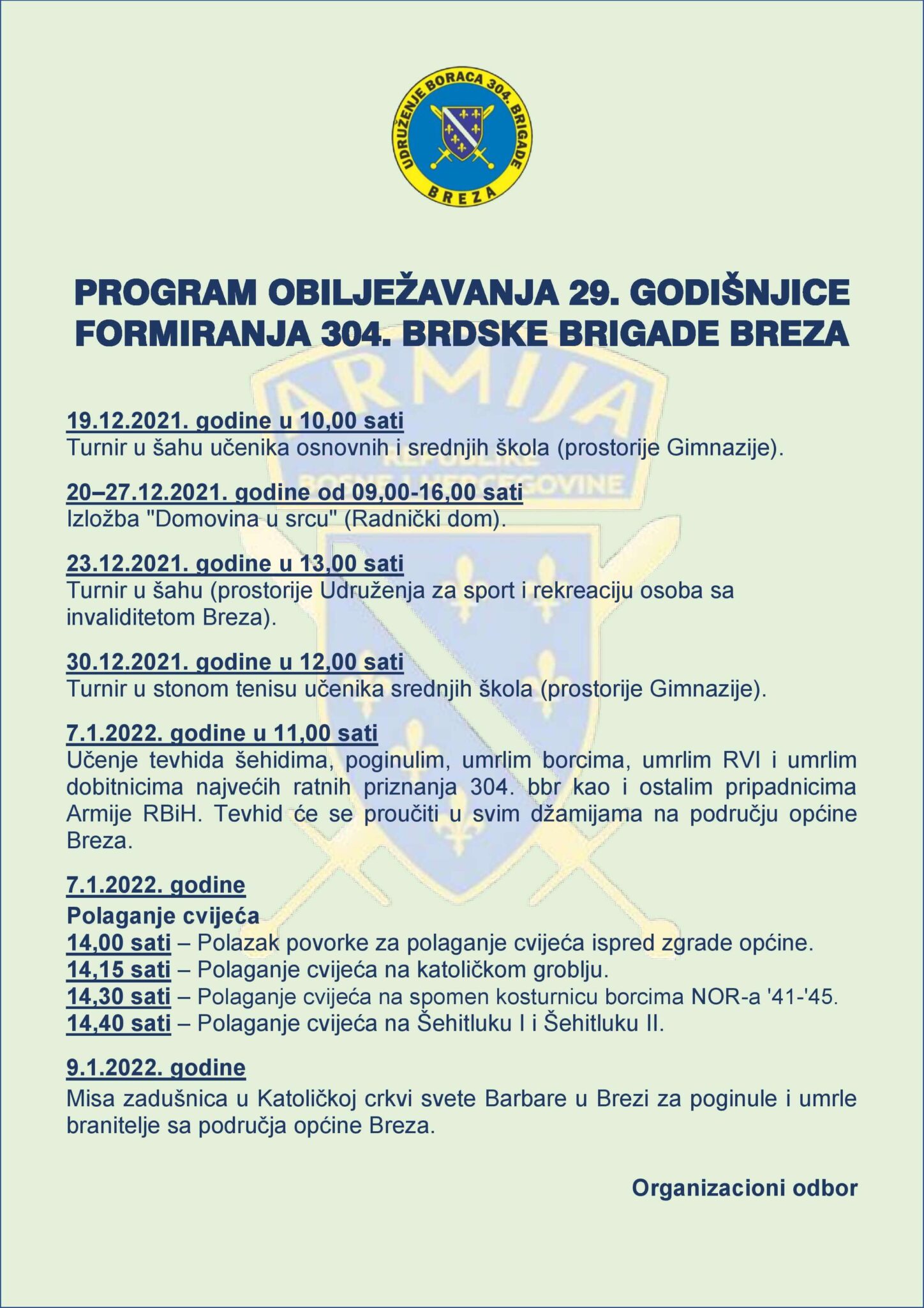 Program obilježavanja 29. godišnjice formiranja 304. brdske brigade Breza
