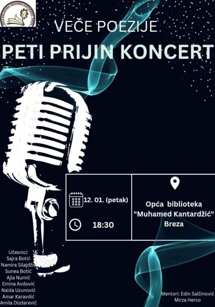 Poetsko veče pod nazivom “Peti Prijin koncert” bit će održano u Općoj biblioteci “Muhamed Kantardžić” Breza, u petak, 12. decembra, sa početkom u 18:30 sati.