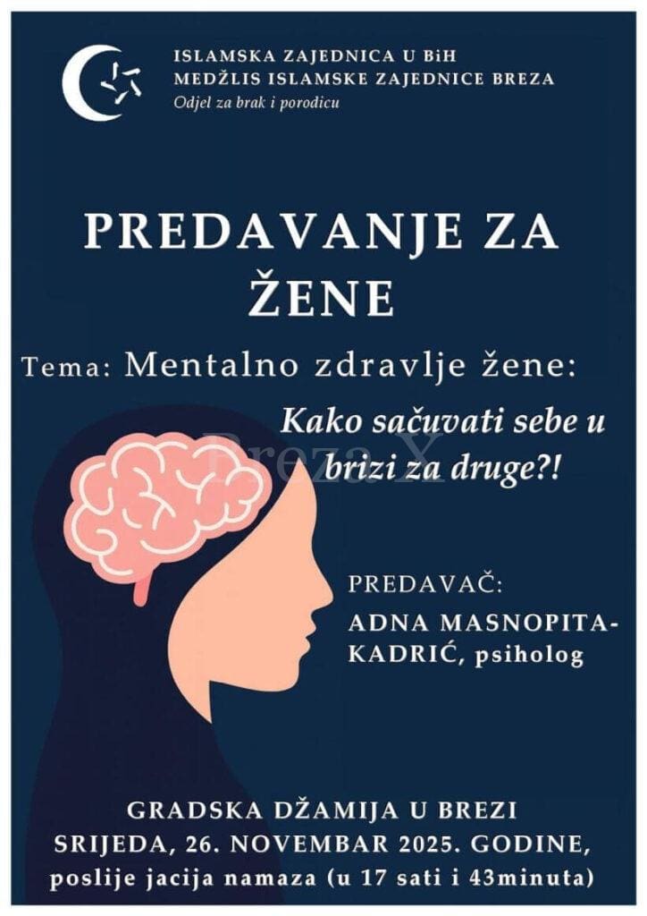 Medžlis Islamske zajednice Breza, kroz Odjel za brak i porodicu, organizuje posebno predavanje namijenjeno ženama, posvećeno temi koja je od izuzetnog značaja u savremenom životu – mentalnom zdravlju.