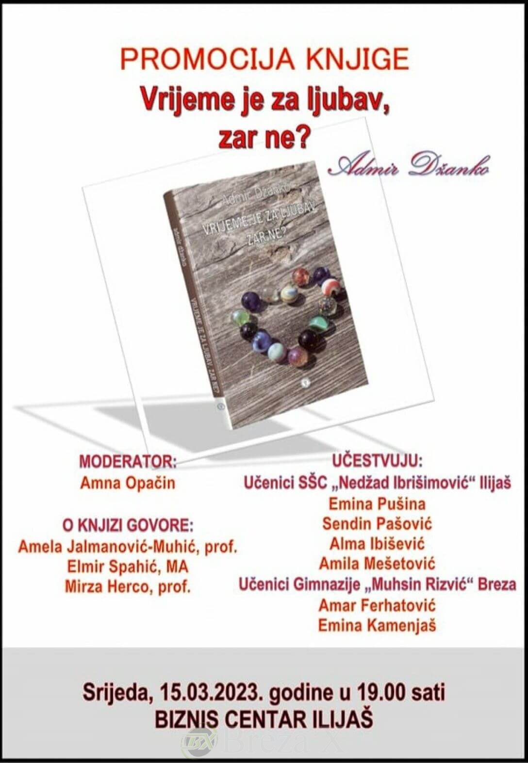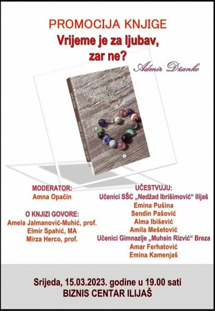 Pozivamo vas na promociju zbirke priča “Vrijeme je za ljubav, zar ne?” autora Admira Džanke, koja će se održati u srijedu, 15. marta 2023. godine, sa početkom u 19 sati, u Biznis-centru Ilijaš, a u organizaciji JU KSC i Radio Ilijaš.