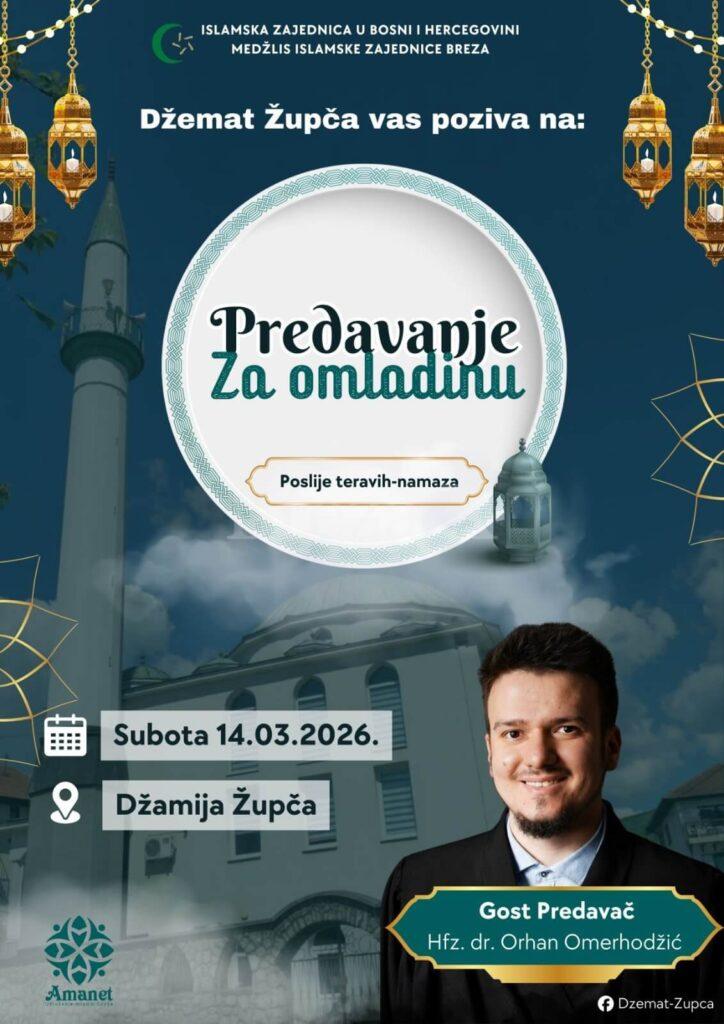 Nakon zajedničkog iftara i obavljenog teravih-namaza u džamiji u Župči, prisutni će imati priliku prisustvovati predavanju za omladinu koje će održati gost predavač hfz. dr. Orhan Omerhodžić. Predavanje će biti prilika da mladi čuju korisne savjete i poruke koje se odnose na vjeru, život i izazove s kojima se suočava omladina danas.