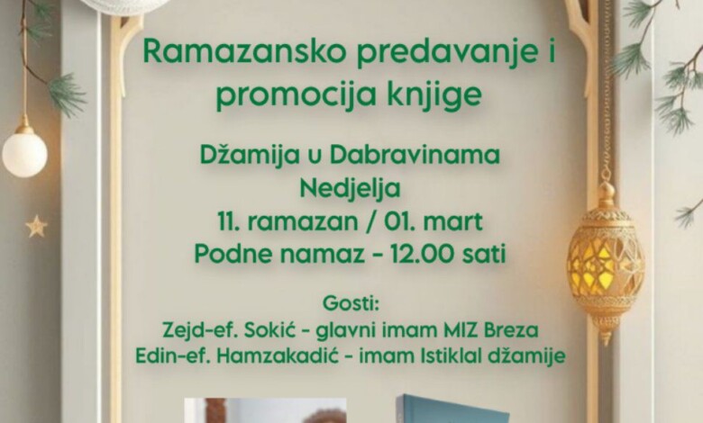 U organizaciji Islamske zajednice u BiH – Medžlis IZ Breza, Džemat Dabravine, u nedjelju, 11. ramazana (01. marta), bit će upriličeno ramazansko predavanje i promocija knjige u džamiji u Dabravinama.