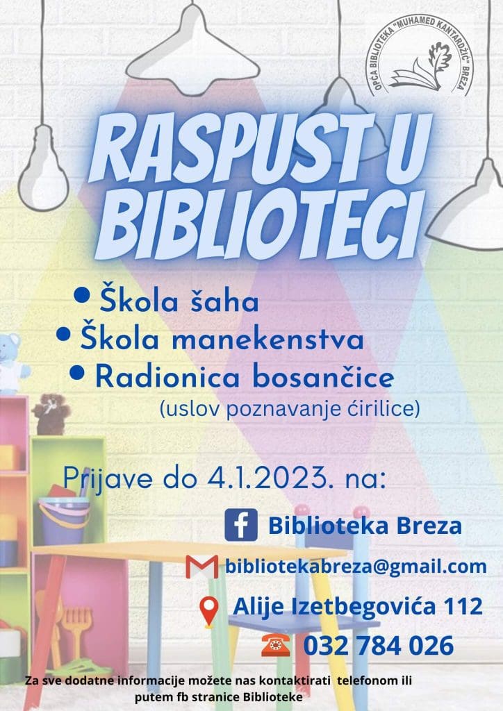 Opća biblioteka “Muhamed Kantardžić” Breza i ove godine za učenike osnovnih i srednjih škola organizuje bogat program u okviru projekta “Raspust u biblioteci”. U želji da zimski raspust provedete što kvalitetnije i sadržajnije, Biblioteka i ove godine organizuje niz edukativno-zabavnih sadržaja.