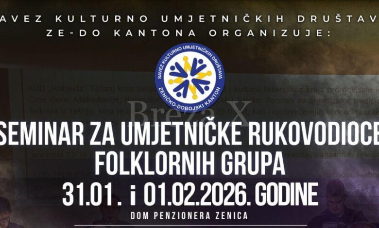 Savez kulturno-umjetničkih društava Zeničko-dobojskog kantona organizira dvodnevni Seminar za umjetničke rukovodioce folklornih grupa, koji će biti održan 31. januara i 1. februara 2026. godine u Domu penzionera u Zenici.