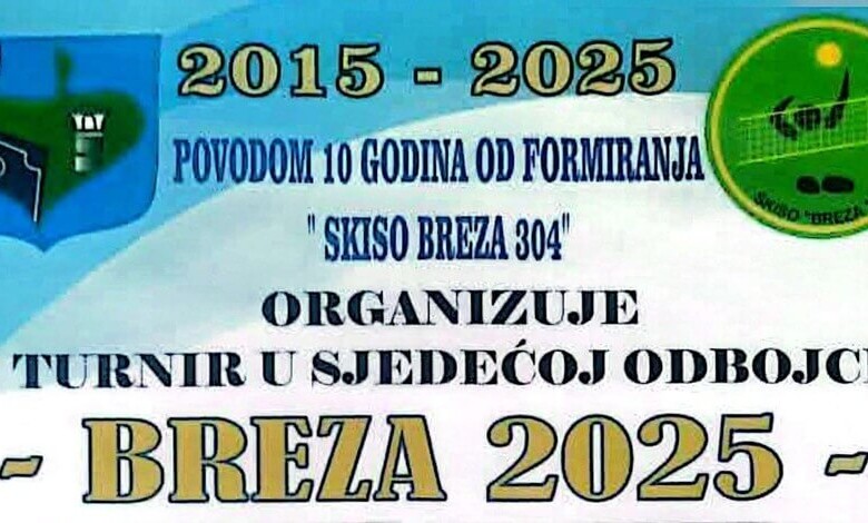 U povodu 10 godina postojanja “SKISO Breza 304” (2015.-2025.) pod pokroviteljstvom Vlade Zeničko-dobojskog kantona i općine Breza organizuje turnir u sjedećoj odbojci pod nazivom “Breza 2025” u subotu, 14. juna 2025. godine u sali srednjih škola u Brezi sa početkom u 10 sati.