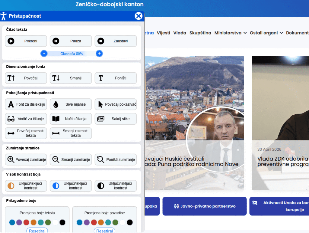Službene internet stranice Zeničko-dobojskog kantona (www.zdk.ba) podigle su nivo pristupačnosti za osobe sa invaliditetom. Odjeljenje za informatičku podršku Stručne službe Vlade Zeničko-dobojskog kantona integrisalo je dodatak koji osobama sa invaliditetom omogućuje više različitih opcija za samostalno prilagođavanje izgleda stranica kako bi se lakše snalazili i pregledali sadržaje.