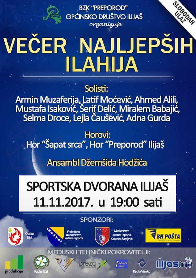 Tradicionalni koncert “Večer najljepših ilahija”, 12. po redu u organizaciji BZK “Preporod” Ilijaš, bit će upriličen u subotu 11. novembra 2017. godine , sa početkom u 19:00 sati u Sportskoj dvorani Ilijaš.