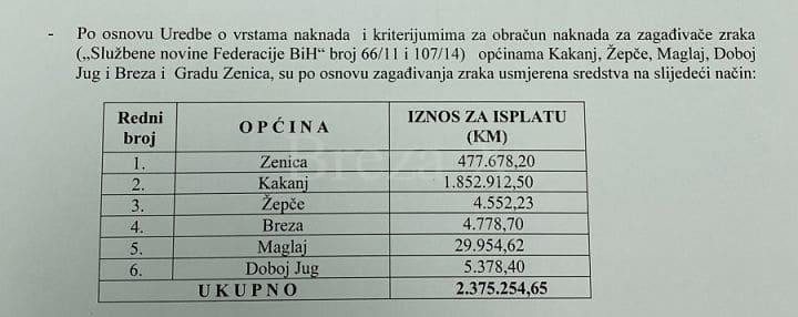 Treba pojasniti da se najveći iznos sredstava po osnovu Uredbe „Zagađivač plaća“ transferira Općini Kakanj iz razloga što je u tolikom omjeru i najveći priliv sredstava u Fond iz ove općine, a na osnovu naknada koje uplaćuju privredni subjekti poput Termoelektrane, Cementare ili Rudnika Kakanj itd.