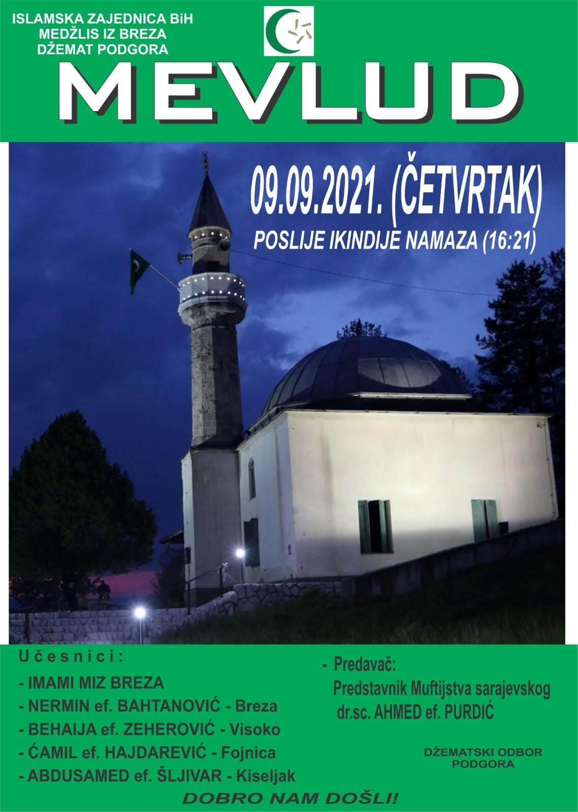Na lokalitetu Stara džamija u Podgori u četvrtak, 9. septembar 2021. godine poslije ikindije namaza sa početkom u 16 sati i 21 minut održat će se tradicionalni mevlud i zikr.