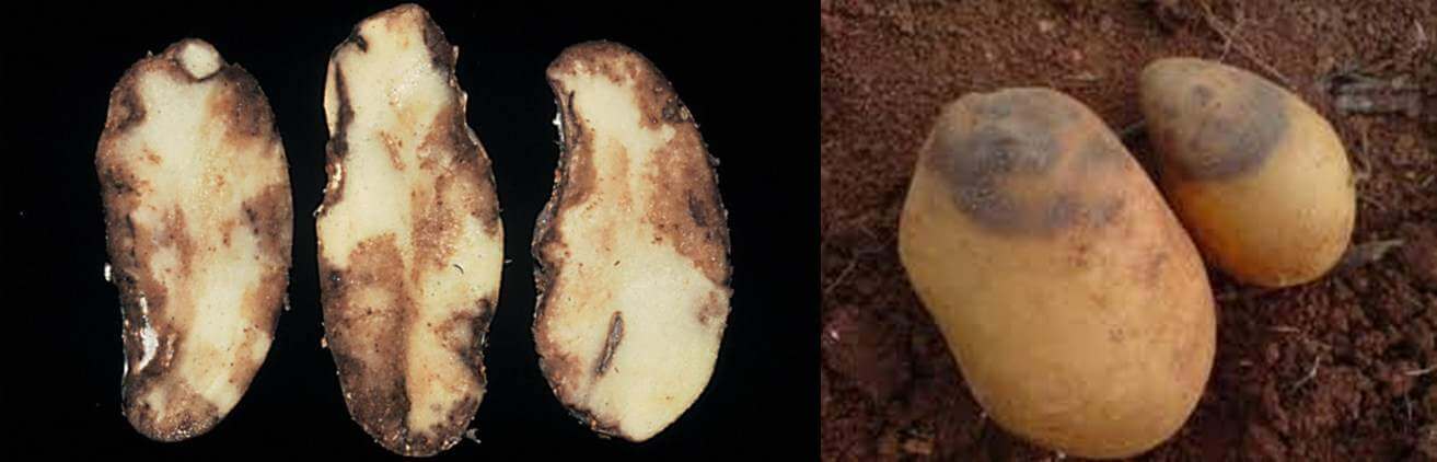 Spore gljive se brzo šire, posebno krajem maja, ukoliko je vlažno vrijeme. Glavni izvor zaraze su gomolji, prepoznatljivi po plavo–smeđim površinskim udubljenjima. Na presjeku gomolja, u unutrašnjosti ispod pjega tkivo ima smeđe–rđastu boju. Oboljele gomolje obično naseljavaju saprofitni mikroorganizmi, zbog čega one truhnu i imaju neprijatan miris.