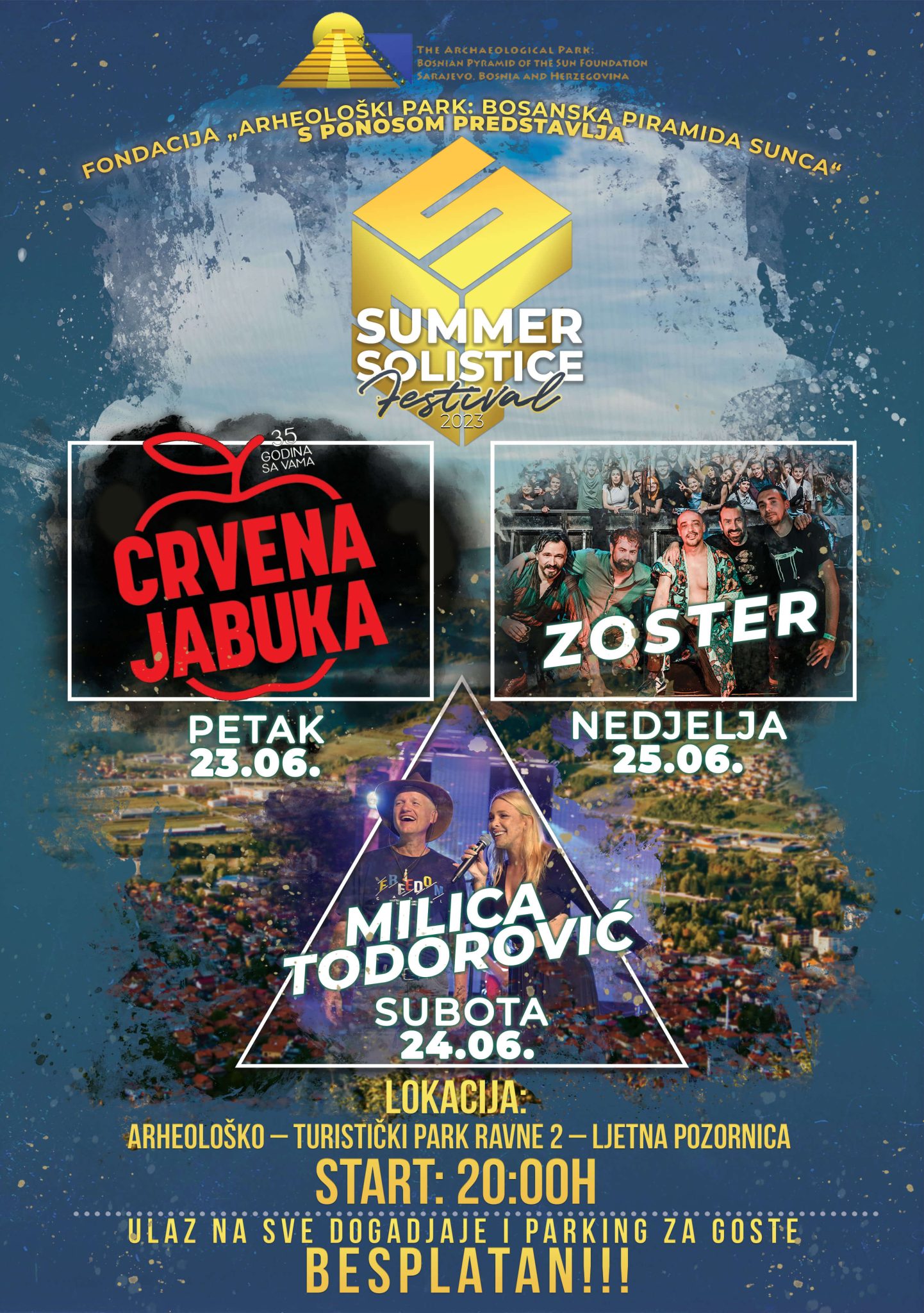Tradicionalni festival povodom početka ljeta, odnosno ljetnog solsticija, održava se i ove godine u najljepšem parku na jugu Evrope, ‘Arheološko-turističko-sportskom parku Ravne 2’ u Visokom. Programi počinju u srijedu 21. juna 2023. i traju do nedjelje 25. juna 2023. U večernjim satima na ljetnoj pozornici ‘Vremeplova’ bit će održan muzičko-dramski spektakl, mjuzikl ‘Quo vadis homo’’ Omladinskog hora iz Zenice. Na koncertnoj bini zabavljaće nas Milica Todorović, Crvena jabuka i grupa ‘Zoster’.