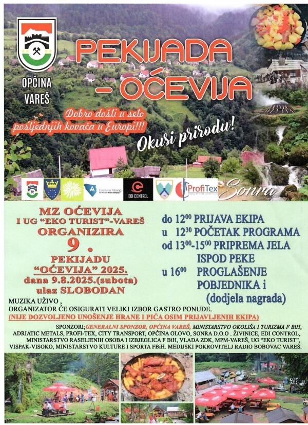 U organizaciji Mjesne zajednice Oćevija i udruženja “EKO TURIST” Vareš, u subotu 9. augusta 2025. godine u selu Oćevija, poznatom kao posljednje selo kovača u Evropi, održat će se međunarodno takmičenje u pripremi jela ispod peke, pod nazivom “PEKIJADA 2025”.