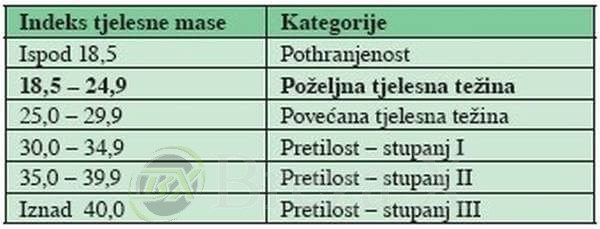 Prema Indeksu tjelesne mase, pothranjene osobe su one koje ITM/BMI imaju ispod 18,5, poželjnu tjelesnu težinu imaju svi oni sa indeksom od 18,5 do 14,9, a povećanu od 25 do 29,9. Pretile osobe se dijele u tri stepena, ovisno o indeksu, i to – prvog (od 30 do 34, 9), drugog (35 do 39,9) ili trećeg stepena (iznad 40,0).