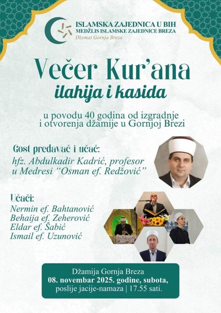 U povodu obilježavanja 40 godina od izgradnje i otvorenja džamije u Gornjoj Brezi, Medžlis Islamske zajednice Breza – Džemat Gornja Breza organizuje svečanu manifestaciju pod nazivom „Večer Kur’ana, ilahija i kasida“.
