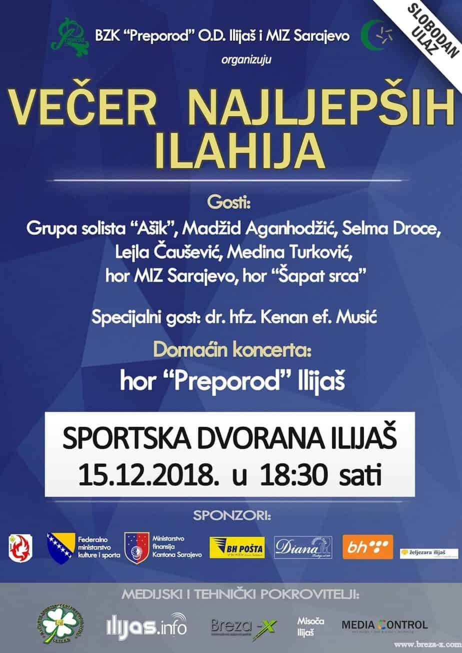 Tradicionalni koncert “Večer najljepših ilahija”, 13. po redu u organizaciji BZK “Preporod” Ilijaš i MIZ Sarajevo, bit će upriličen u subotu 15. decembra 2018.godine, sa početkom u 18:30 sati u Sportskoj dvorani Ilijaš.